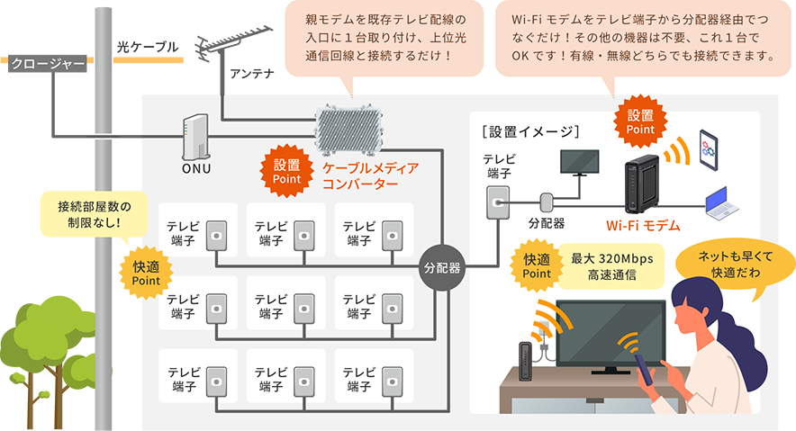 お客様!テレビ配線がある建物ならば、どんな建物でも簡単にWi-Fi環境にできますよ!